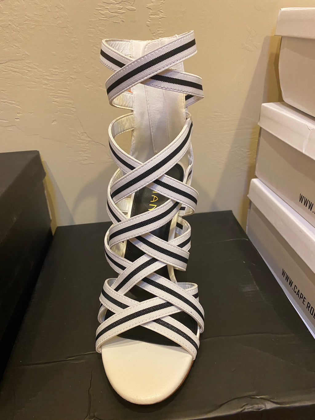 BLACK PAT TRANSPARENT METALLIC SLANTED HEEL